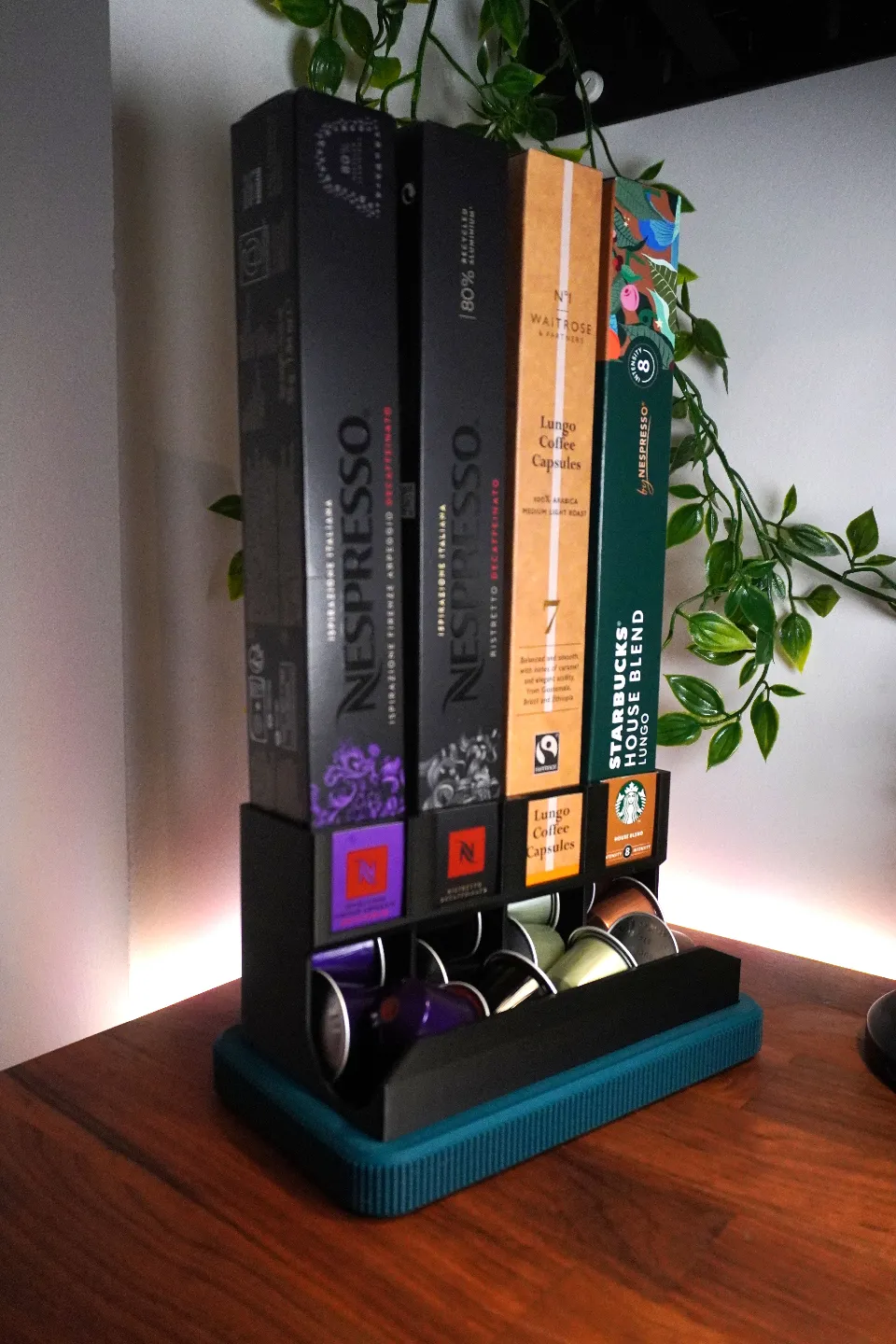 Organizador vertical para cápsulas. Ahorra espacio en cocina.