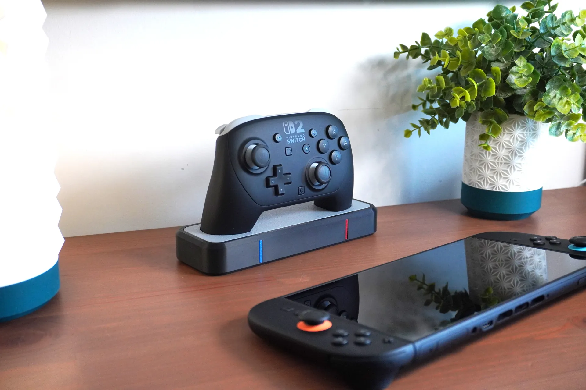 Soporte de mesa para controles Switch 2. Compacto y firme.